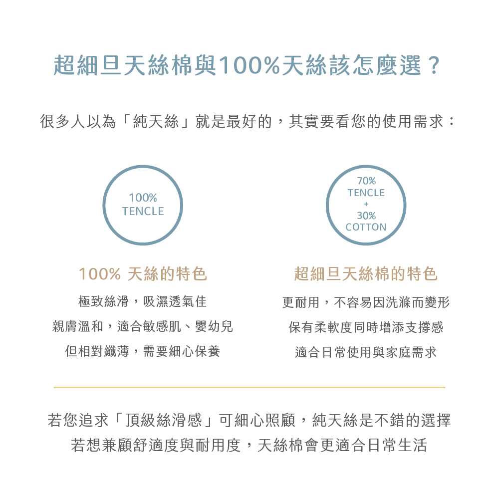 市面上常見的高階材質有「純天絲」與「天絲混紡棉」