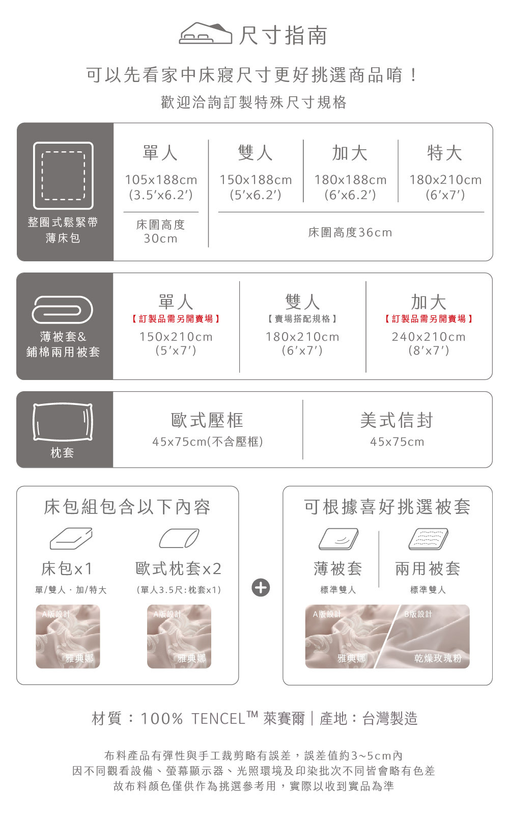 ✅ 淺色天絲寢具屬敏感色系,應避免與深色衣物(如牛仔褲)長時間摩擦接觸,以防移染。