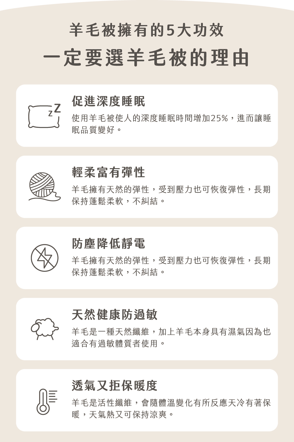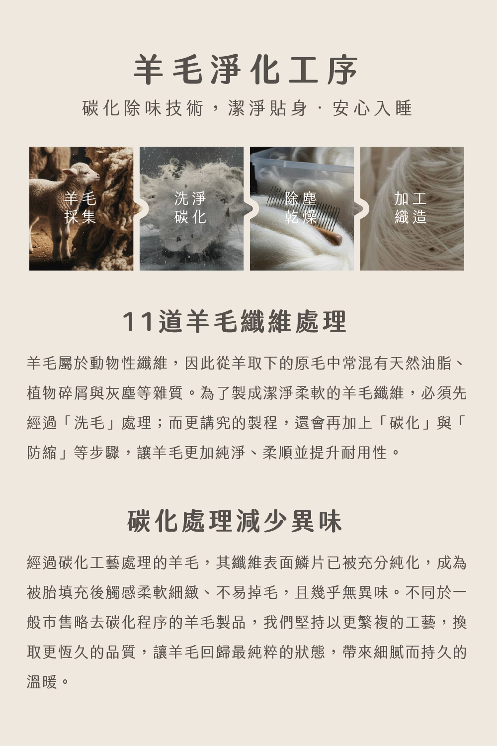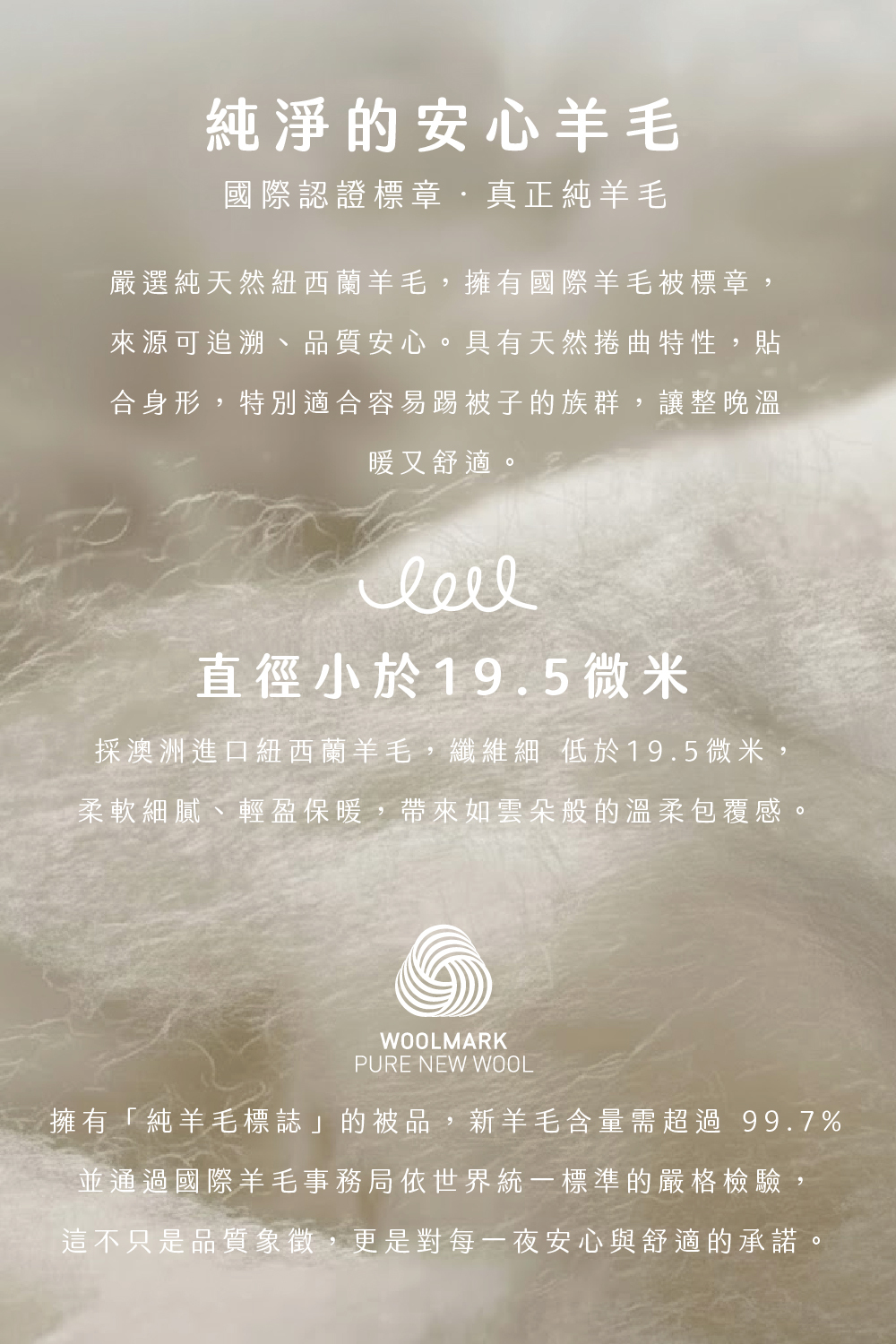 成 分:100%純羊毛;表布100%棉 (防蟎抗菌處理)
