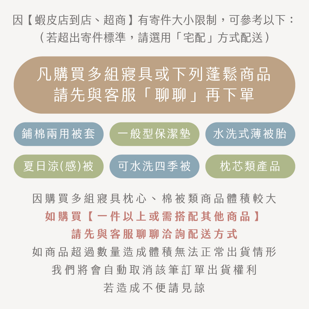 💡賣場上的 【鋪棉兩用被套】或【四季水洗被】因體積較大!!