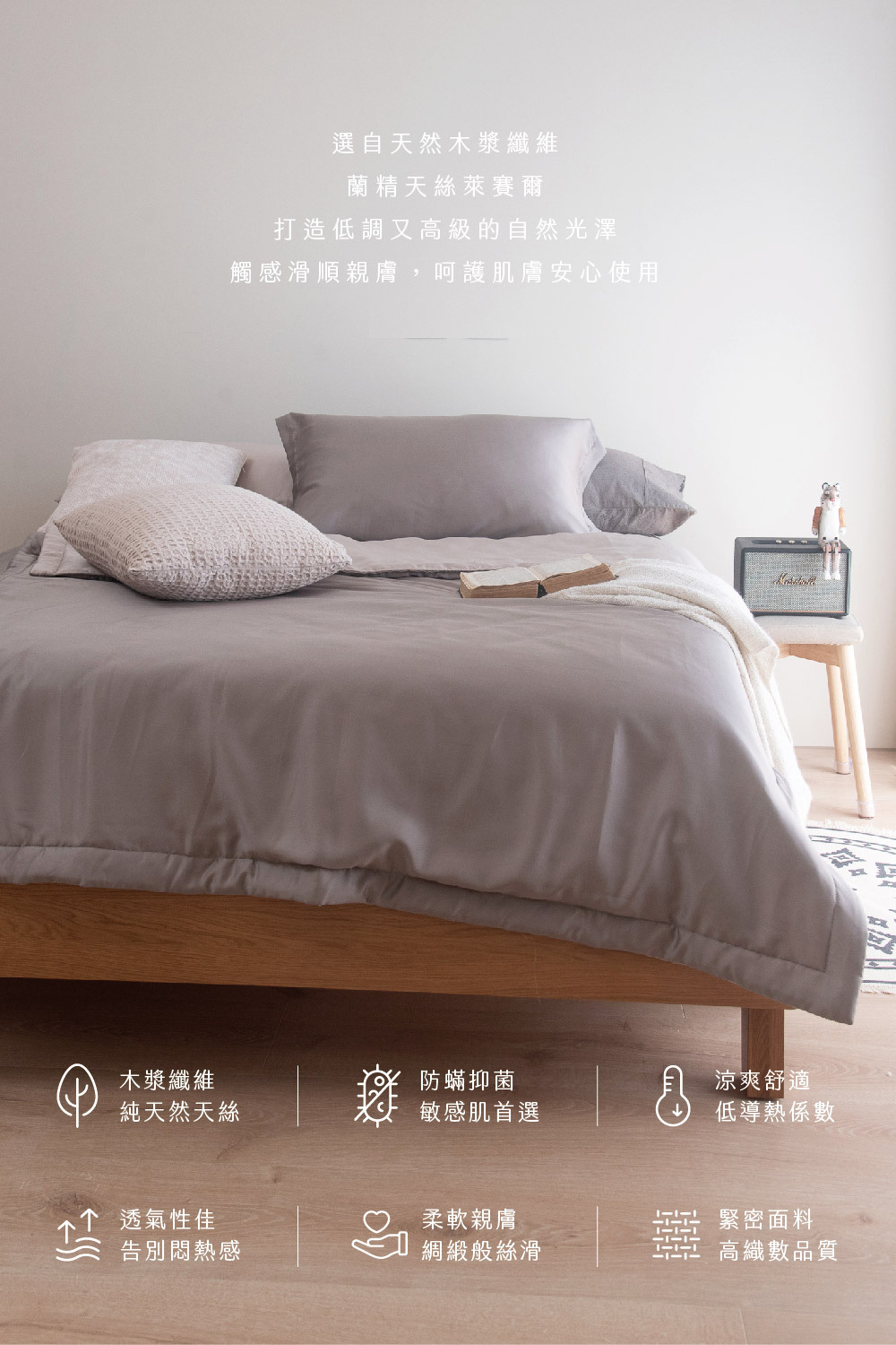 ✅ 淺色天絲寢具屬敏感色系,應避免與深色衣物(如牛仔褲)長時間摩擦接觸,以防移染。